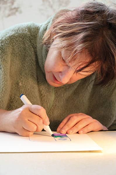 Seit Herbst 2024 lebt Manuela im Einzelzimmer. Anfangs zögerlich, nahm sie am Kunstangebot von Janna Ressel teil. Dort malt und zeichnet sie – trotz Sehbehinderung – mit Leidenschaft. „Ich habe die Bilder im Kopf. Um die richtigen Farben zu wählen, frage ich nach, welche Gegenstände sie haben.“ Für sie sind Kunst und Kreativität Ausdruck von Lebensfreude und Lebensmut. Sie hält den Kopf dicht übers Papier, malt Linien ohne Schablone, konzentriert und voller Energie.